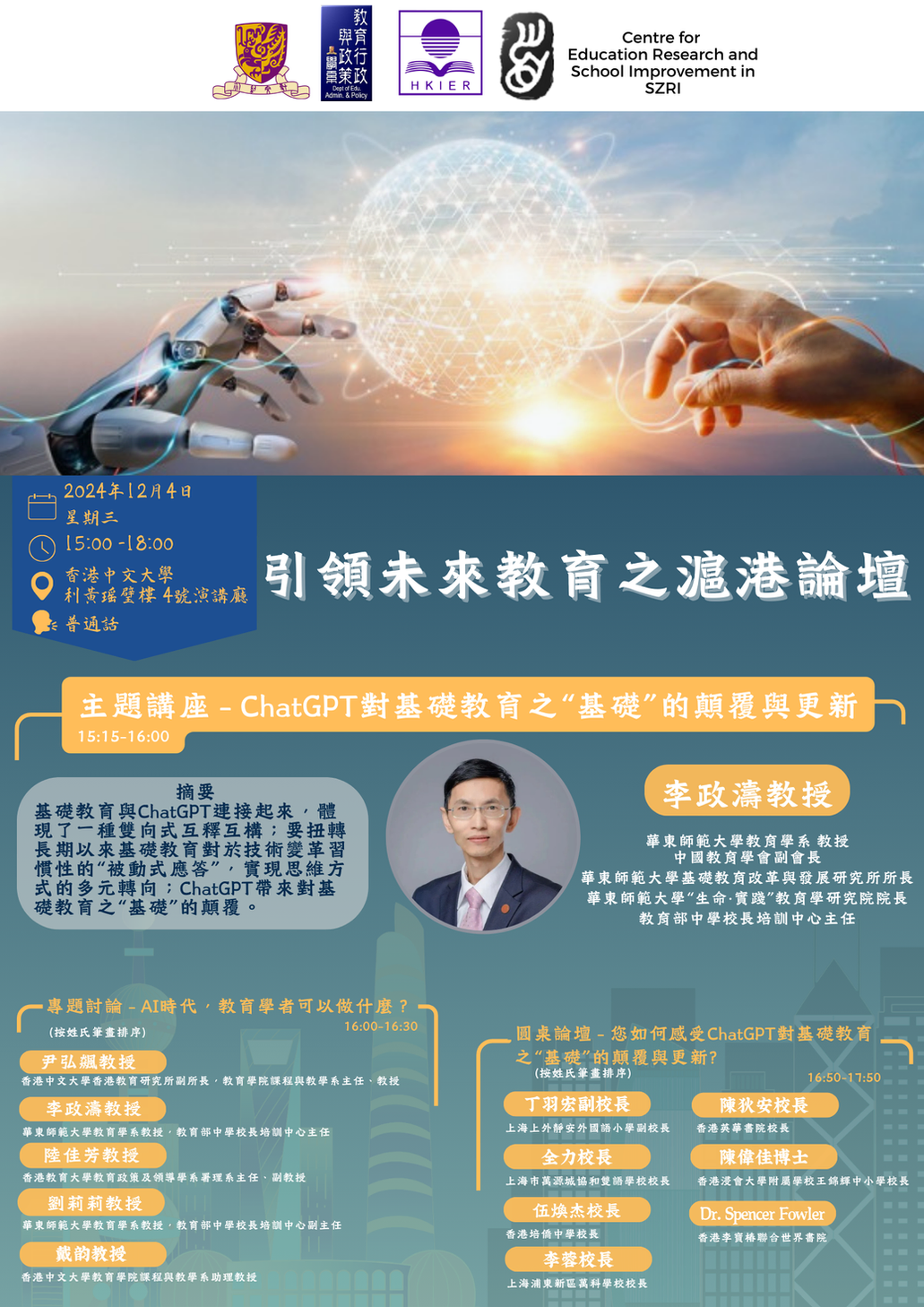 | 2024年12月4日,教學研究與學校改進中心主任 尹弘飈教授受邀出席香港教育領導發展中心與教育行政與政策學系舉辦的《ChatGPT對基礎教育之「基礎」的顛覆與革新》引領未來教育之滬港論壇。尹教授與華東師範大學李政濤教授、劉莉莉教授,香港中文大學戴韵教授,以及香港教育大學的陸佳芳教授,就專題《AI時代,教育學者可以做什麼?》進行討論,從學術研究的層面就人工智能與教育的關係交流了各自的見解與發現。 | |